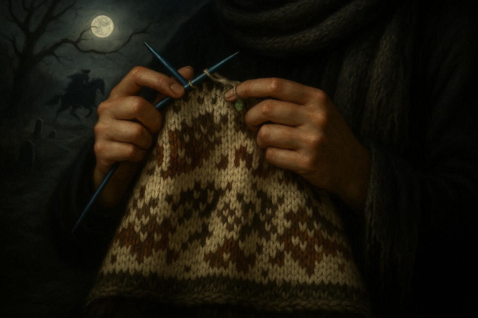So brew your tea, light a candle, and let your needles wander through the Hollow. And if you hear hoofbeats behind you… just knit faster.